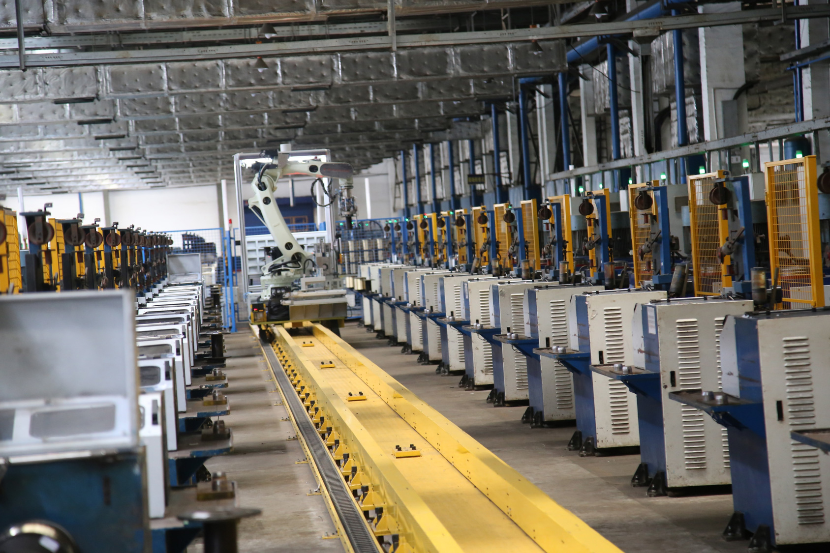水箱濕拉工藝的收線自動上卸輪系統為行業首創,該系統為獨有的氣漲軸配合工字輪收線,采用自主研發的視覺系統,通過大負載6軸機械臂平臺以地軌行走精確定位的方式(重復定位精度0.5mm),1套自動系統負責進行60臺的收線自動化,輔助以AGV自動小車整體運輸,形成一個完整閉環的上卸料結合碼垛的復合機器人產品,同時提供在線輔助生產的信息化系統,為實現無人化車間打下堅實基礎。該產品還整合了工字輪RFID掃描系統,自動上傳機床以及上卸輪信息;并整合絲徑檢測儀實現在線對卸料工字輪進行絲徑質量檢測,通過連接產品信息系統,實現在線質量檢測、反饋和追溯。